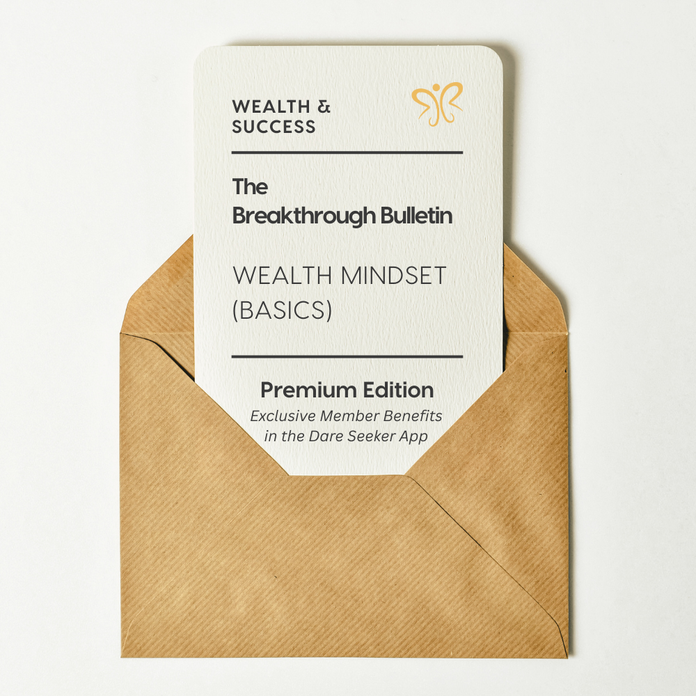 This premium version of The Breakthrough Bulletin invites you to cultivate a powerful Wealth Mindset—think rich, act smart, grow wealth. Inside, you’ll access exclusive prompts, practical clarity tools, and guided practices to rewrite limiting money stories, make values-aligned financial decisions, and build sustainable momentum. Available as an interactive course in the Dare Seeker App, you’ll gain exclusive access to guided prompts, mindset practices, a progress tracker, and a private community to support your journey. You’ll also receive the Bulletin and Growth-in-Action Guide as downloadable PDFs delivered straight to your inbox—so you can reflect anytime, anywhere.
